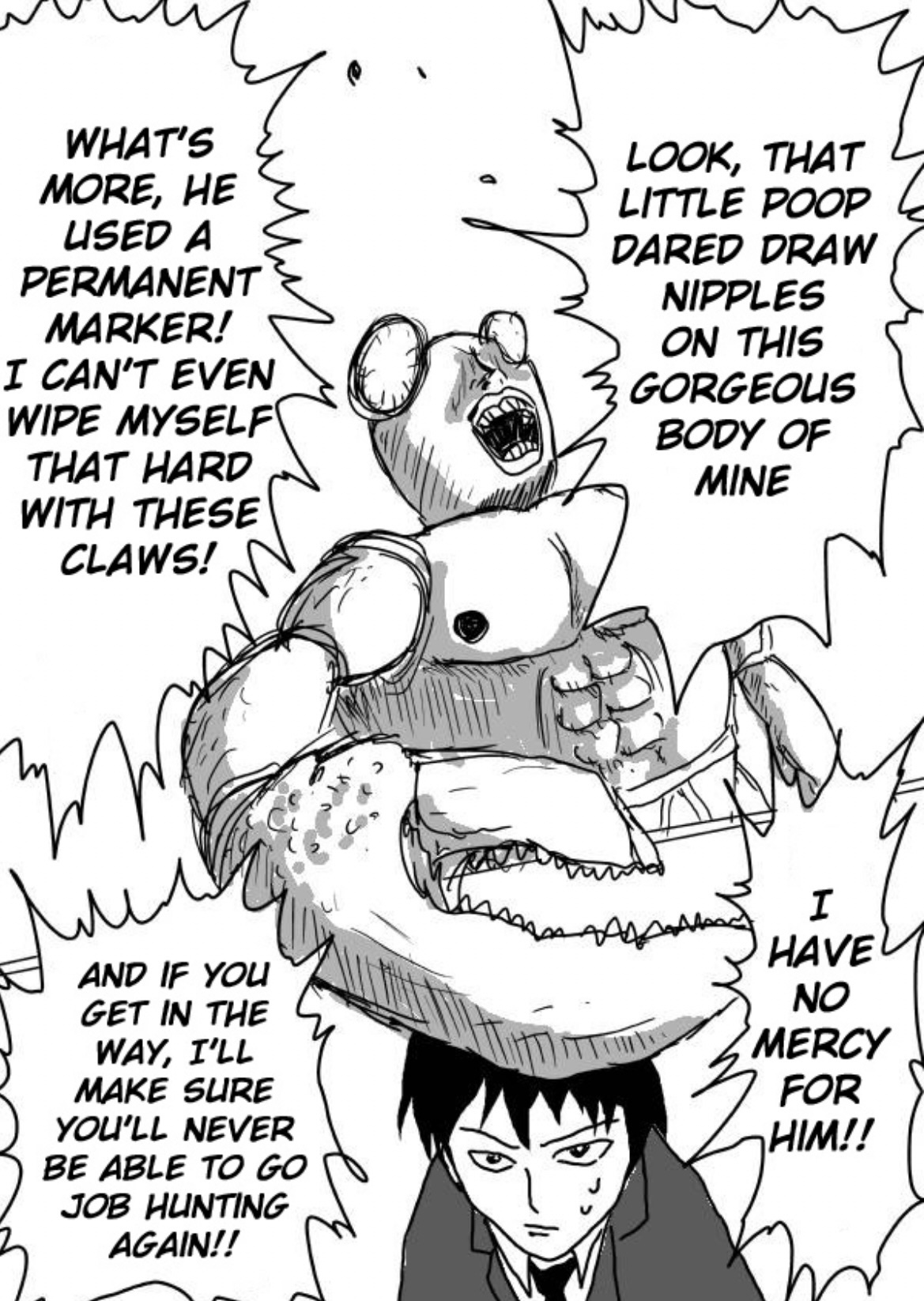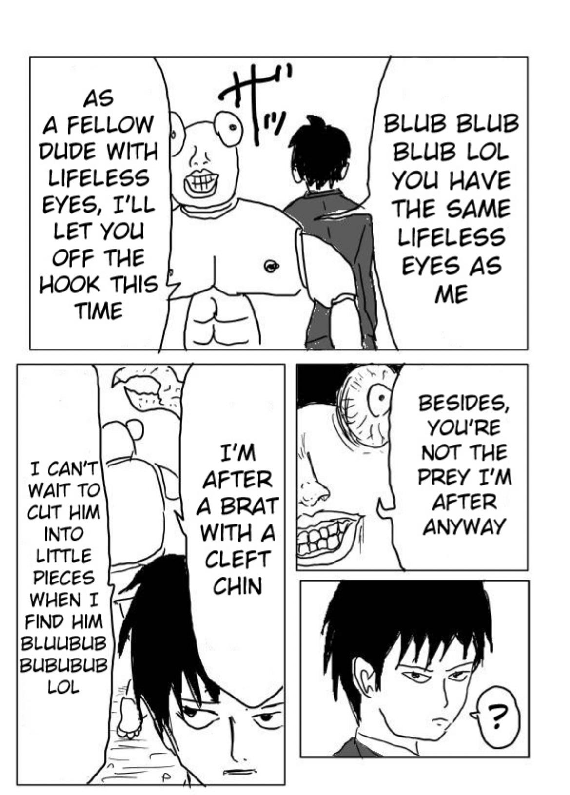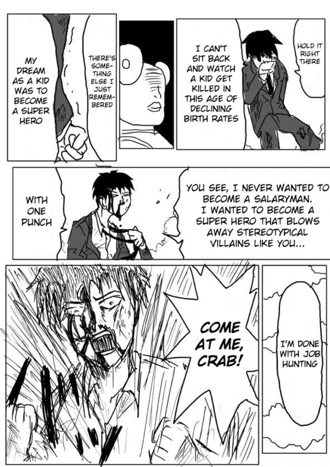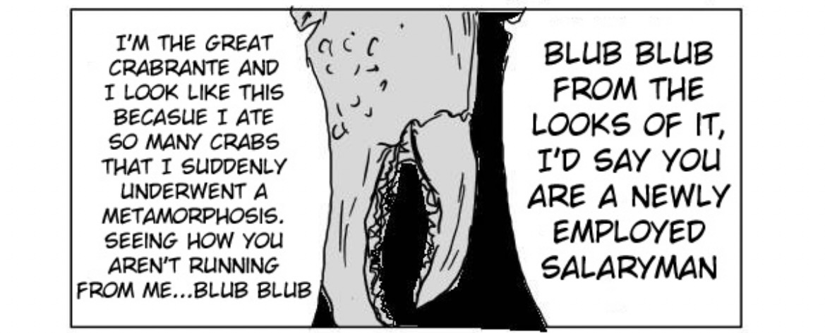 I really wanted to emphasize the importance of appearances in this battle. Crablante is obsessed with how people see him. The child, who is the entire stake in the battle now that Saitama truly has nothing left to lose, has a cleft chin, he’s alone in a world of fleeing “grown ups” and declining birth rates with only his soccer ball for company. Whether or not the kid is worth anything comes back to Saitama as the battle between a suited cabal which seems to drag him by the tie by an eye that is increasingly not his own, and those “core memories” as a child (and even as an adult) which seem, in some cases, to grant supernatural powers. From friction with the most dogged efforts which melt a person’s wax right from their dusty pedestal in a museum, to tales of heroism, martyrdom, knightood, and outstanding honor, a person who believes in themself can overcome ridiculous odds, and brush off even the scathing and insightful ridicule of tots. From Nietzsche: “He who has a why to live can bear almost any how”. So I saw in this fight a discussion of someone with their mirror when they realize those memories of that awkward prepubescent face, not just one’s own face but also one’s immature understanding of the world, it’s infant face also, do not match up with what we see standing there. The world, and I, are ugly. I’ve been present in many conversations that denounce one’s young activities that they used to first grasp the world, play and laugh with the world, as “slacking off”. Something could have been done better, they might say about bouncing on a trampoline, rolling with a puppy, laughing with family, pizza partying, or chasing a ball into a creeping Crablante. But, I assure you, when you were there, you were better looking. One by one the bullies… Inside jokes, your happy eccentricities, one by one grew nipples and shelling. It went so far you learned you could bully yourself and that way you could do anything. At what cost? Black and white lighting…