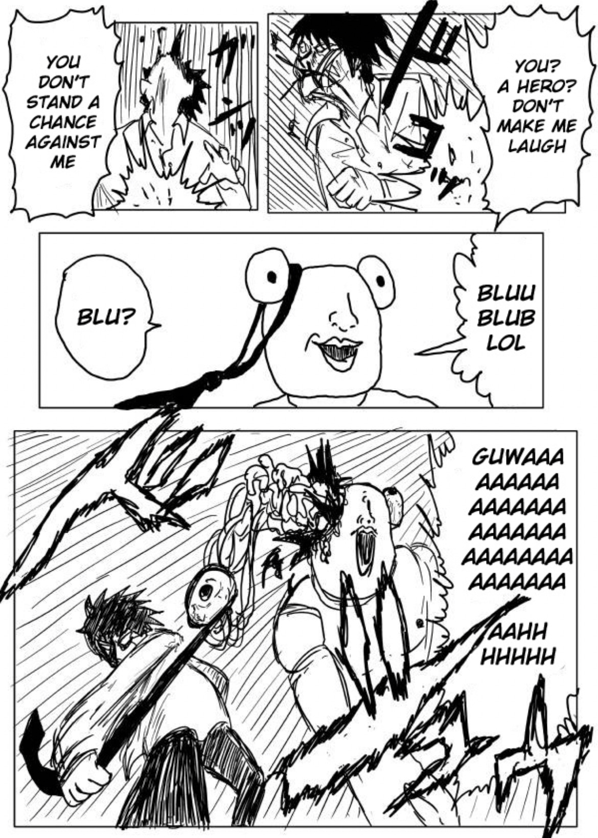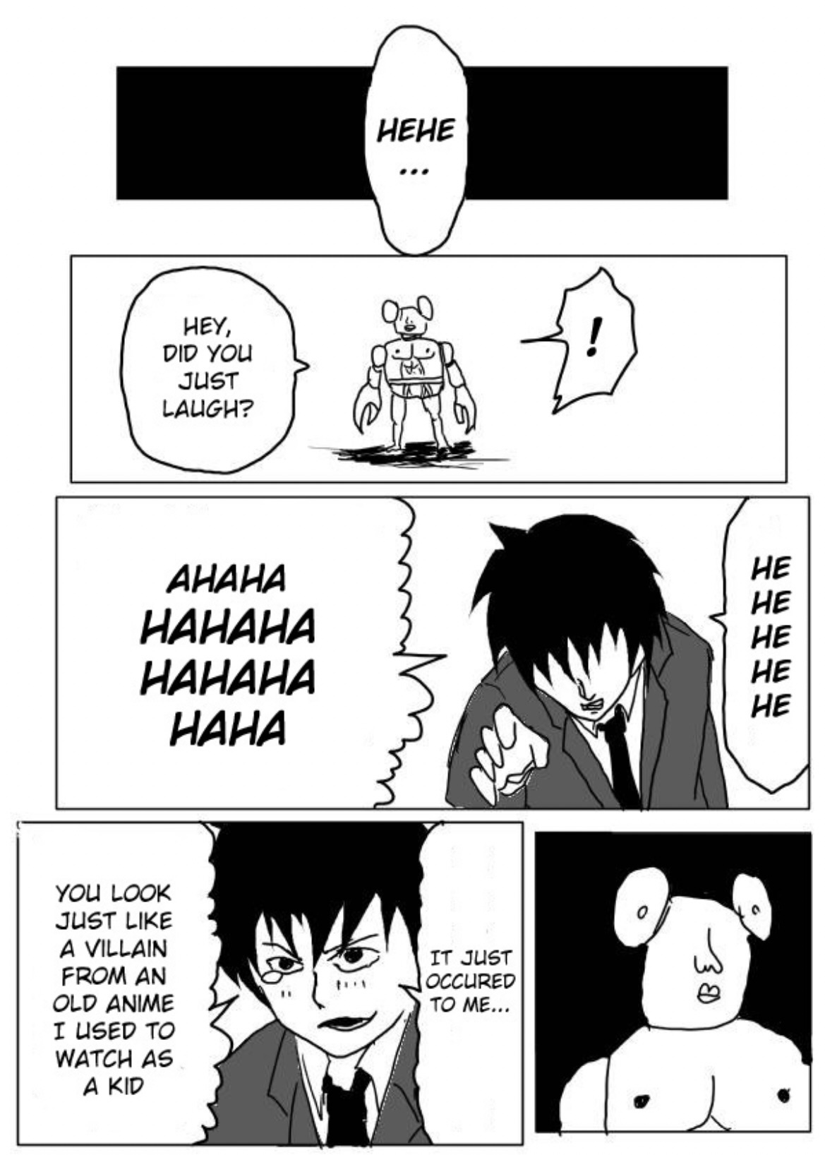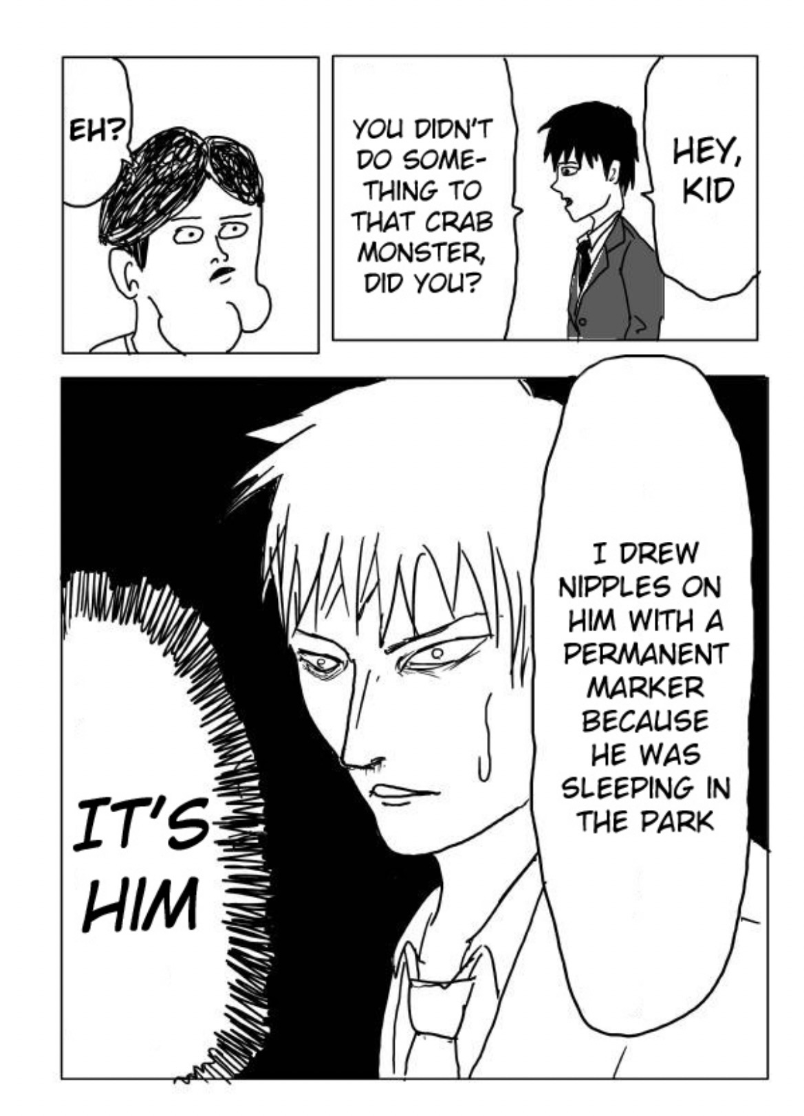 I really wanted to emphasize the importance of appearances in this battle. Crablante is obsessed with how people see him. The child, who is the entire stake in the battle now that Saitama truly has nothing left to lose, has a cleft chin, he’s alone in a world of fleeing “grown ups” and declining birth rates with only his soccer ball for company. Whether or not the kid is worth anything comes back to Saitama as the battle between a suited cabal which seems to drag him by the tie by an eye that is increasingly not his own, and those “core memories” as a child (and even as an adult) which seem, in some cases, to grant supernatural powers. From friction with the most dogged efforts which melt a person’s wax right from their dusty pedestal in a museum, to tales of heroism, martyrdom, knightood, and outstanding honor, a person who believes in themself can overcome ridiculous odds, and brush off even the scathing and insightful ridicule of tots. From Nietzsche: “He who has a why to live can bear almost any how”. So I saw in this fight a discussion of someone with their mirror when they realize those memories of that awkward prepubescent face, not just one’s own face but also one’s immature understanding of the world, it’s infant face also, do not match up with what we see standing there. The world, and I, are ugly. I’ve been present in many conversations that denounce one’s young activities that they used to first grasp the world, play and laugh with the world, as “slacking off”. Something could have been done better, they might say about bouncing on a trampoline, rolling with a puppy, laughing with family, pizza partying, or chasing a ball into a creeping Crablante. But, I assure you, when you were there, you were better looking. One by one the bullies… Inside jokes, your happy eccentricities, one by one grew nipples and shelling. It went so far you learned you could bully yourself and that way you could do anything. At what cost? Black and white lighting…